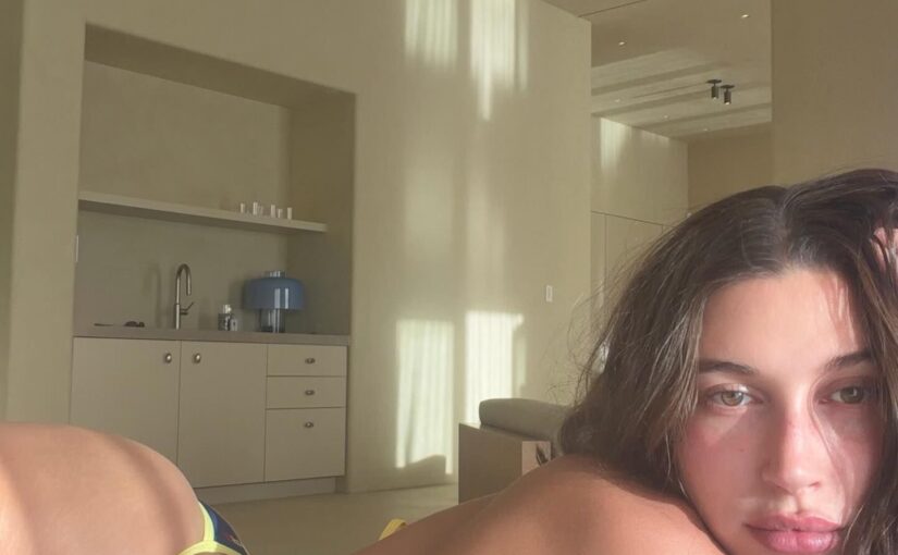 Check out Hailey Bieber’s new selfie – she’s chilling at home in bed, lying on her stomach and flaunting a super‑tiny thong bikini.